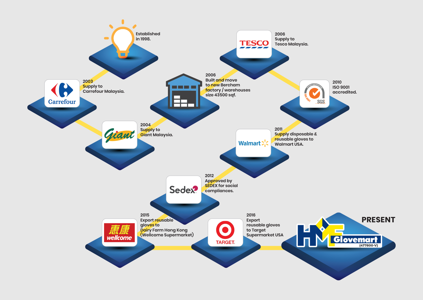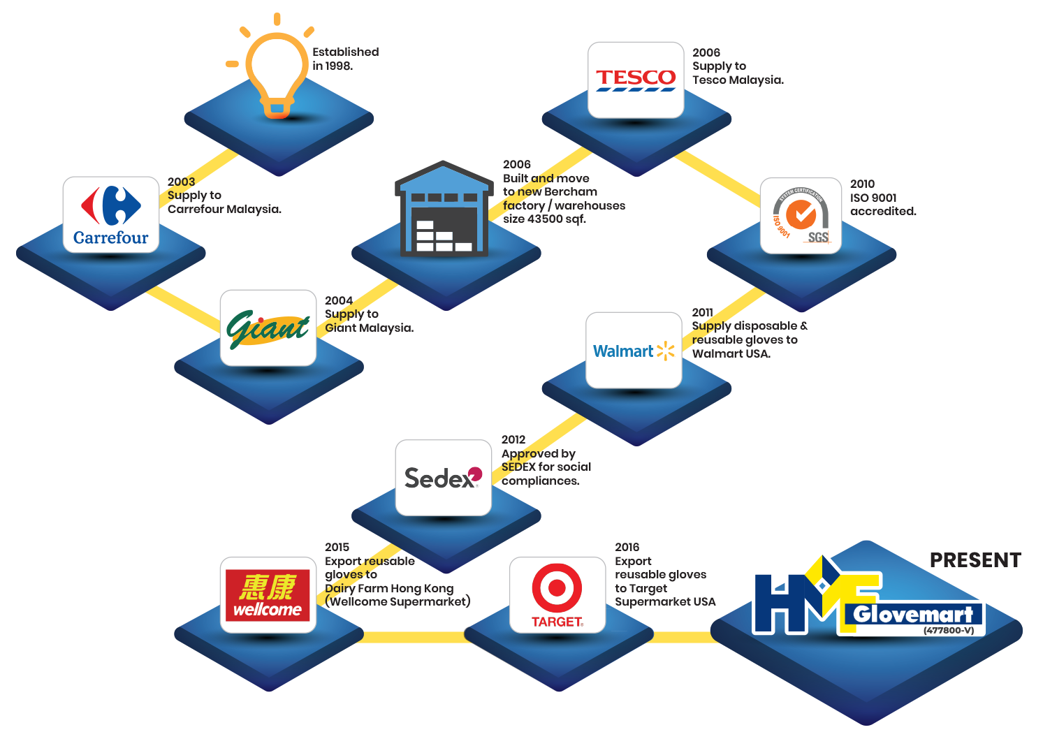 HMF Glovemart Sdn. Bhd, was established in 1998 and embarked on our first production in 2002. We started humbly under a small rented factory. With production demands growing year by year, the company had since relocated to larger accommodations with our own warehouses in Bercham, Ipoh in year 2006.